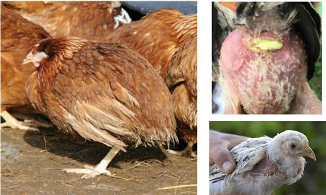 Gà trưởng thành: Kém ăn. phân có màu vàng, gà ủ rũ, chết đột ngột do cơ quan nội tạng bị nhiễm trùng.
